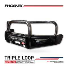 Take on those tough and extreme Off-Road trip with a stylist Triple Loops Phoenix bar! Triple Loops Phoenix bar hits refresh with Light Strips, Diagonal Steel Patterns and designed to be more contour to the vehicle while remaining on the most popular silhouette for most 4WD models. The bar offers the maximum amount of protection including two loops that go over to protect your headlights. Fog Light is also included in this Tripple Loops bull bar to support driving in low visibility conditions