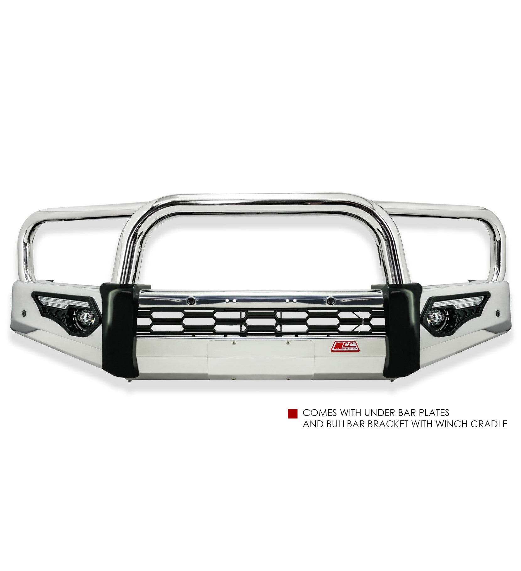 strength performance and fully funtional options! MCC Aluminium Triple Loops Phoenix bar is engineered to offer a next level bull bar in a light-weight class which optimized fuel economy and strength. The Light Strips and Diagonal Steel Pattern develop a modern version of bull bar style. Fog Light is also included in this sensational bull bar to support driving in low visibility conditions
