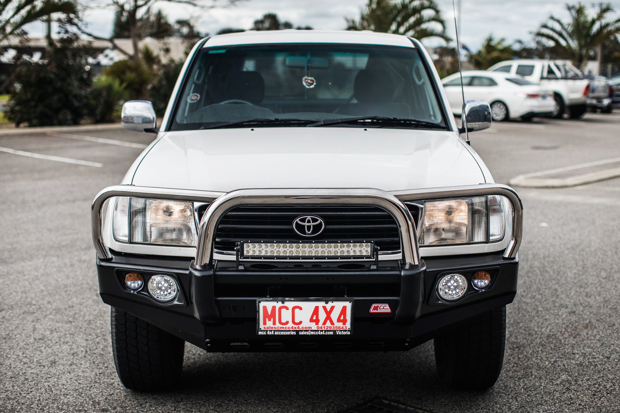Elevate your Toyota Landcruiser 100 series with the MCC 4x4 707-01 Falcon Bar Stainless Steel Triple Loops Bull Bar (01007-701FOGUP), a true icon renowned for its unmatched protection and stylish design.