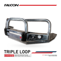 Elevate your Toyota Landcruiser 80 series with the MCC 4x4 707-01A Alloy Falcon Triple loop Bull Bar (01006-701AW), an icon renowned for its light weight and stylish design.