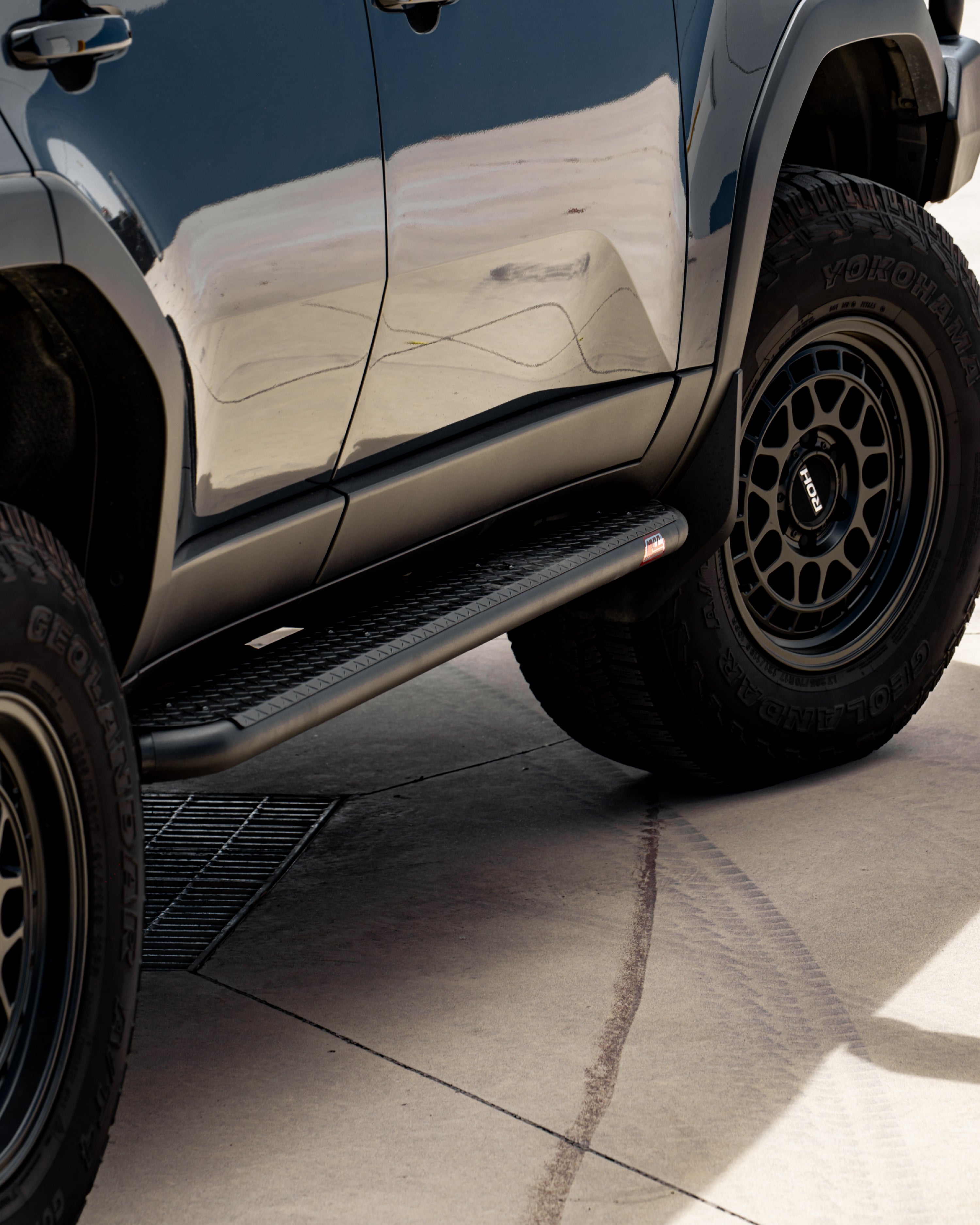 MCC side steps and rails are made from high-strength steel double row tubing with a durable black powder-coated finish to withstand harsh terrain and weather conditions.