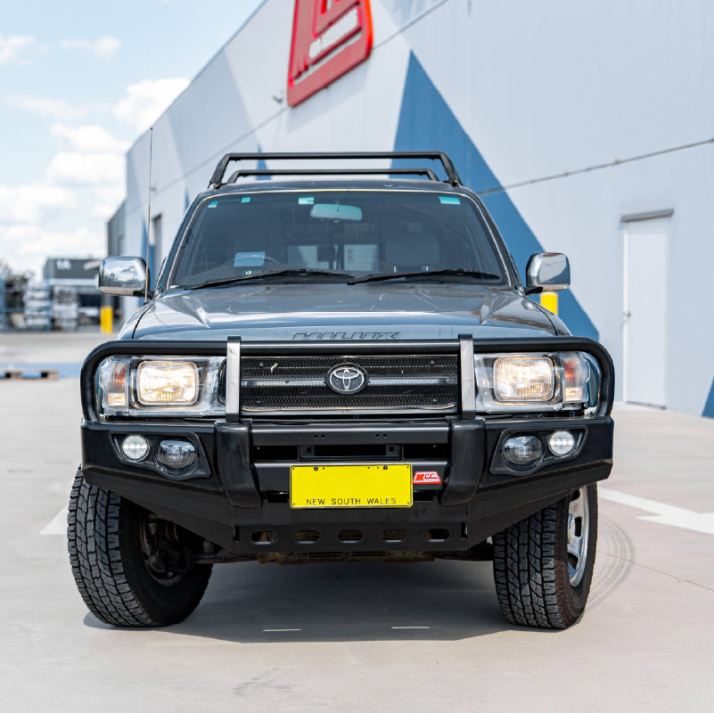 Toyota Hilux 1997-2004 707-02 Falcon Bull Bar Black A-Frame Package (LED Foglight) - SKU MCC-01001-702FOGUP